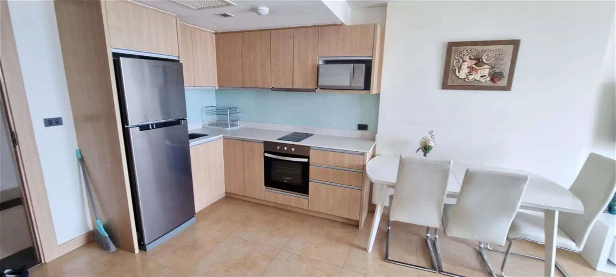 European kitchen with hob (electric), oven, extractor hood, fridge freezer, and microwave