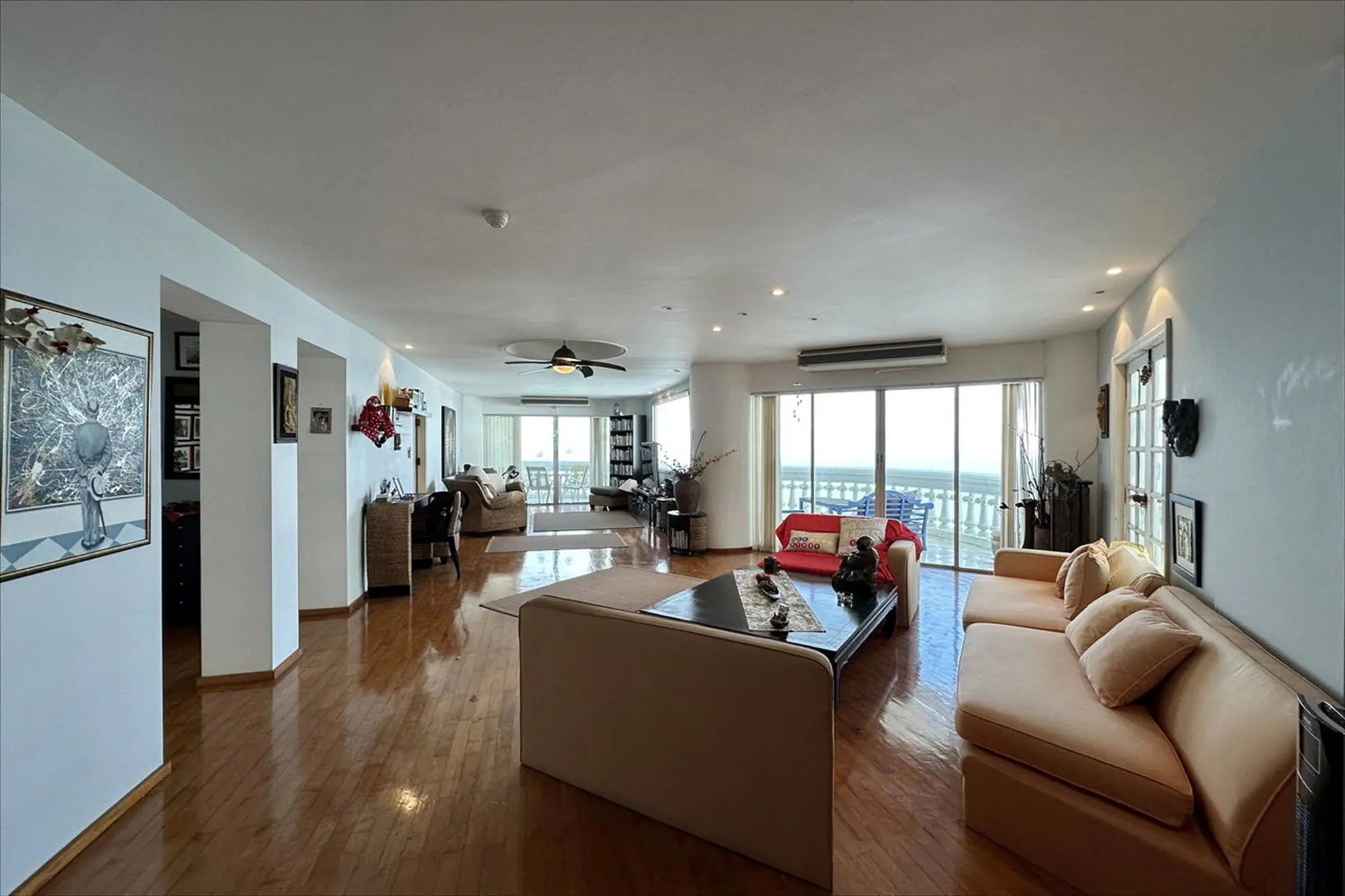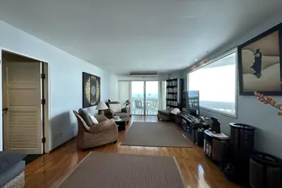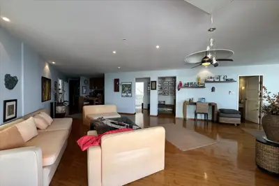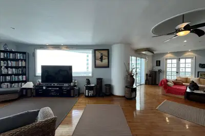 Spanning 174.68 sqm, this spacious condo features an elegant open-plan living and dining area with full-height glass doors opening onto two sea-view balconies, creating a bright and airy coastal atmosphere.